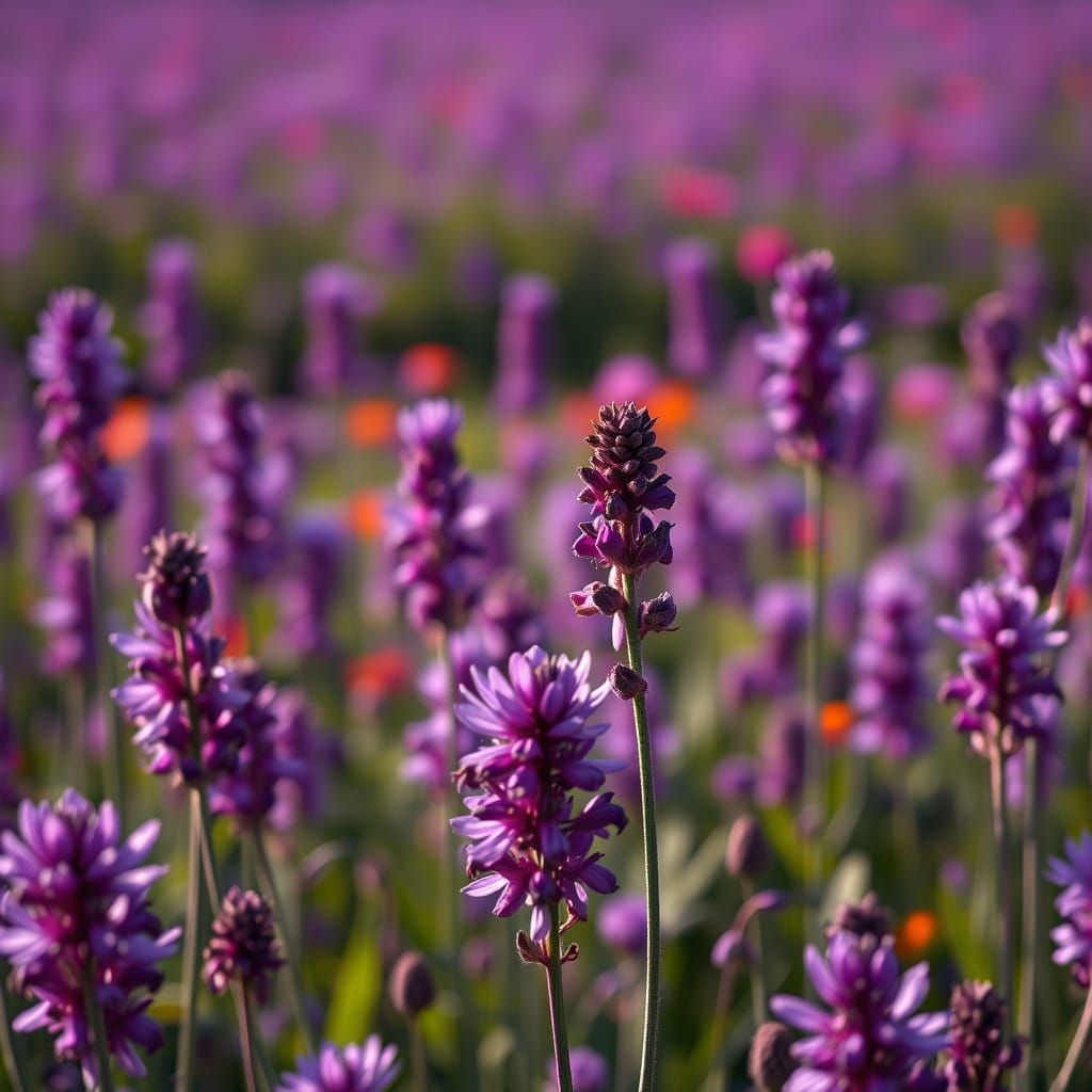 This image shows a stunning field of purple flowers set against a backdrop of the same vibrant blooms, created in a hyperrealistic style with intricate details and dramatic lighting.