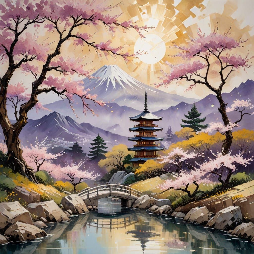 This serene Japanese garden scene features a kintsugi mosaic pagoda surrounded by vibrant cherry blossoms and misty mountains, with delicate lines of liquid gold on Japanese paper and a whimsical neo-impressionist oil painting aesthetic
