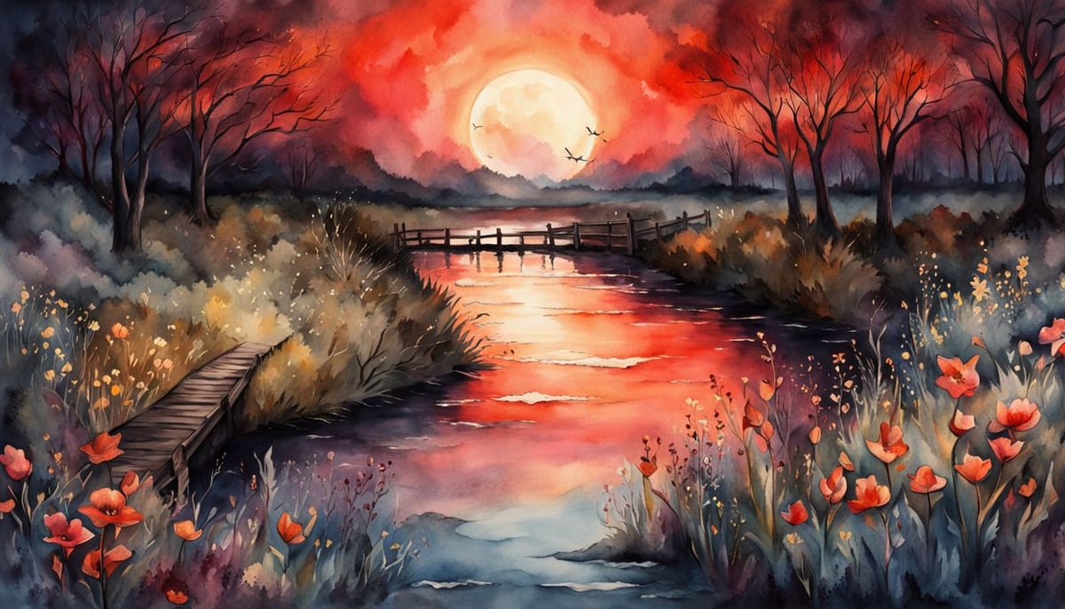 This enchanting watercolor art depicts a mystical lady standing on a small bridge surrounded by wildflowers, bathed in the soft, warm light of a red sunrise during a dark eclipse, creating a captivating and dreamy atmosphere.