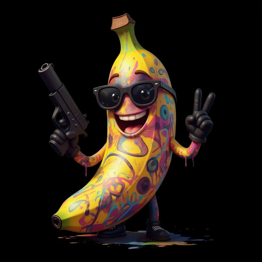 A humorous cartoon banana wearing sunglasses, holding a gun and forming a peace sign. This digital matte painting is detailed and dramatic.