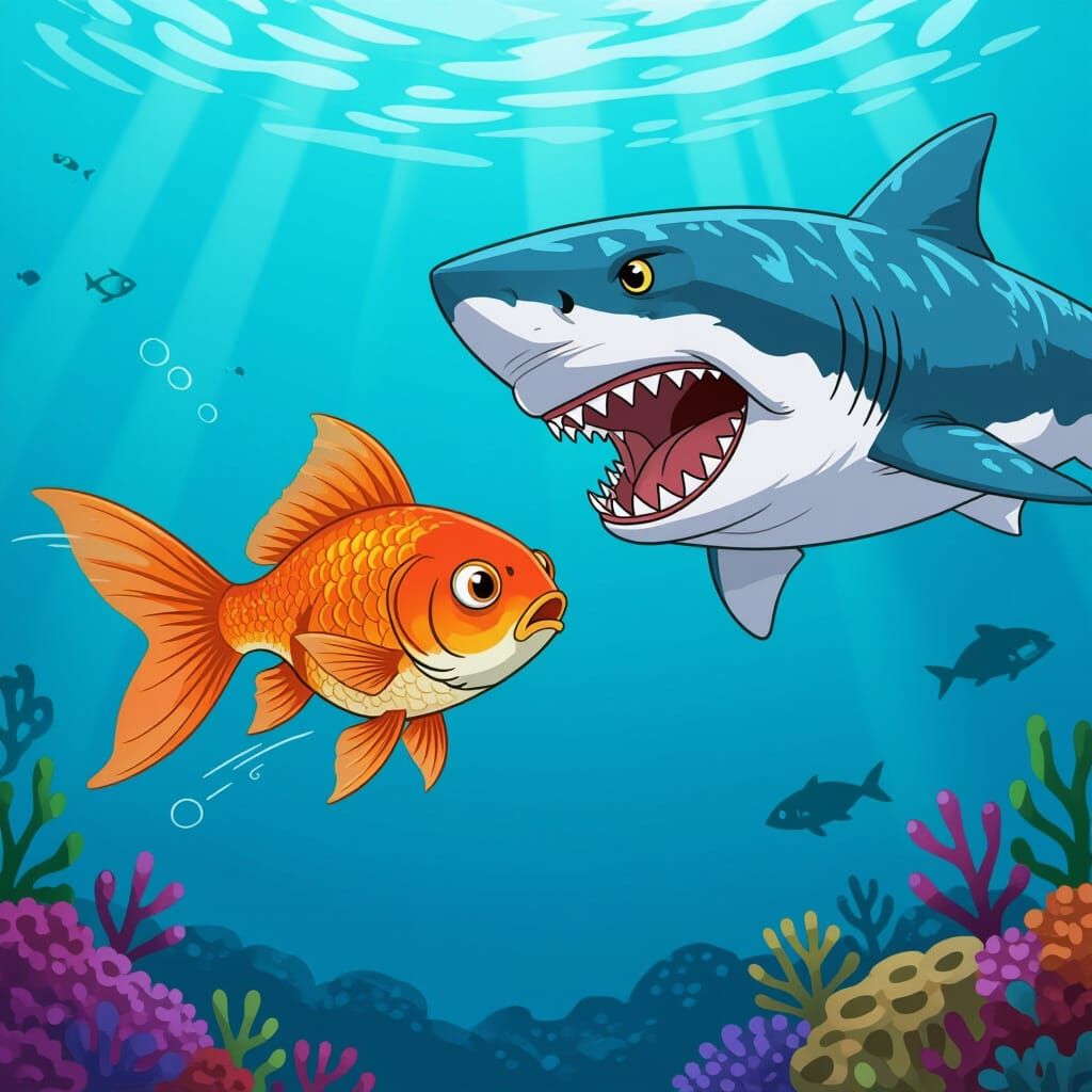 This image shows a panicked goldfish with bright orange scales and blue fins swimming away from a large shark. The scene is rendered in a colorful, cel-shaded art style.