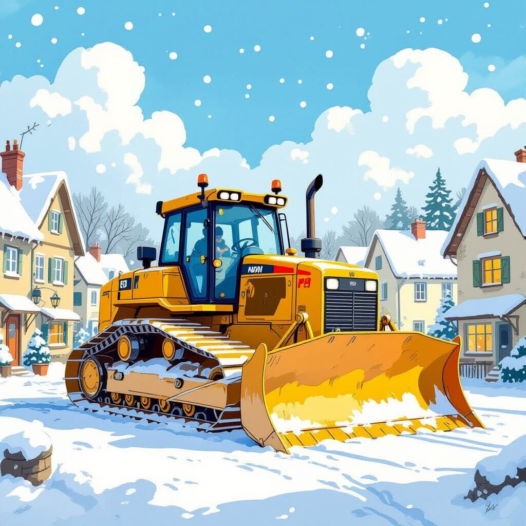 This image shows a large yellow bulldozer parked in a snow-covered village square. Houses with fairy lights surround the square under a blue sky, rendered in a whimsical watercolor style.