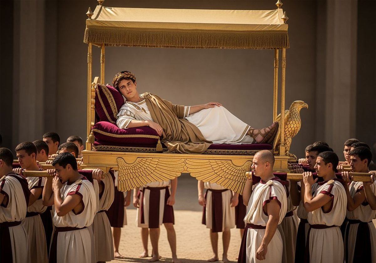 A sunlit scene depicts a young Roman Emperor reclining on velvet pillows atop an imperial eagle litter. Twenty servants carry the litter, evoking classical photography with shallow depth of field.