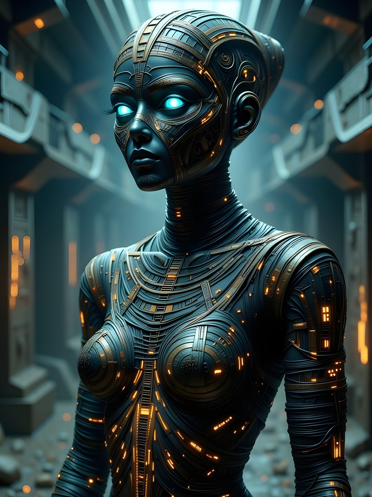 This image features a closeup portrait of a modern interpretation of a mummy, rendered with dark, glowing Egyptian aesthetics and a contemporary twist.