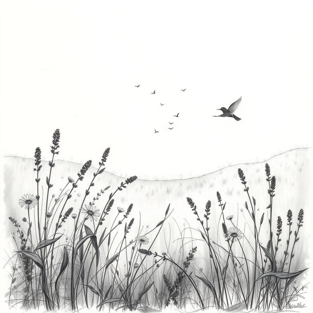 This image displays vibrant wildflowers bathed in gentle morning sunshine, with dew drops glistening. Rendered as a hyperdetailed charcoal drawing, it captures the soft caress of a spring breeze.