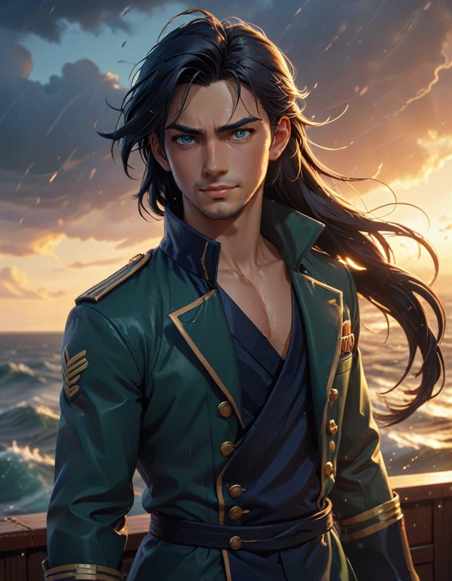 This vibrant anime artwork depicts a young sea captain standing confidently on a ship deck, looking out at the stormy sea with a charismatic smile and sparkling blue-green eyes. Created in a dynamic cel-shaded style with soft focus background and cinematic lighting.