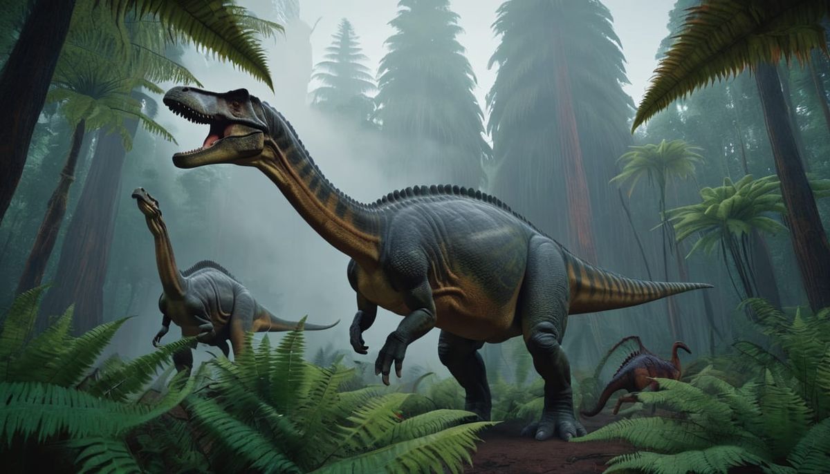 Ultra-detailed cinematic scene of the Jurassic Period: A colossal Brachiosaurus herd strides through a misty, primeval rainforest of giant ferns and towering conifers.