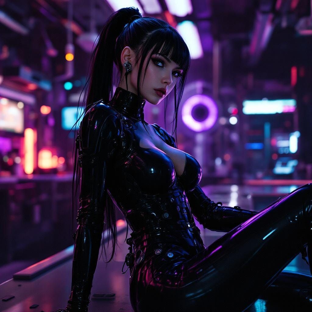 This image shows a futuristic android woman in a sleek black jumpsuit, posing in a dark neon-lit laboratory with a vibrant purple atmosphere. The artwork has a cyberpunk aesthetic.