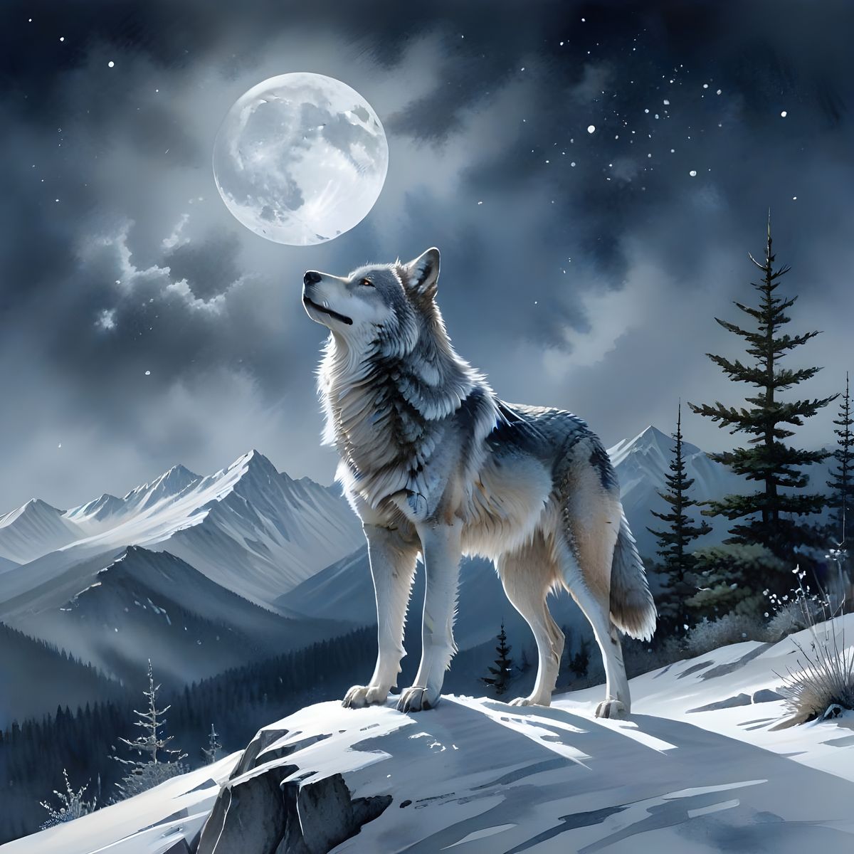 This image shows a majestic wolf on a snow-covered mountain peak under a full moon. The scene is rendered in soft watercolor style, with muted blues and grays, creating an ethereal and tranquil atmosphere.