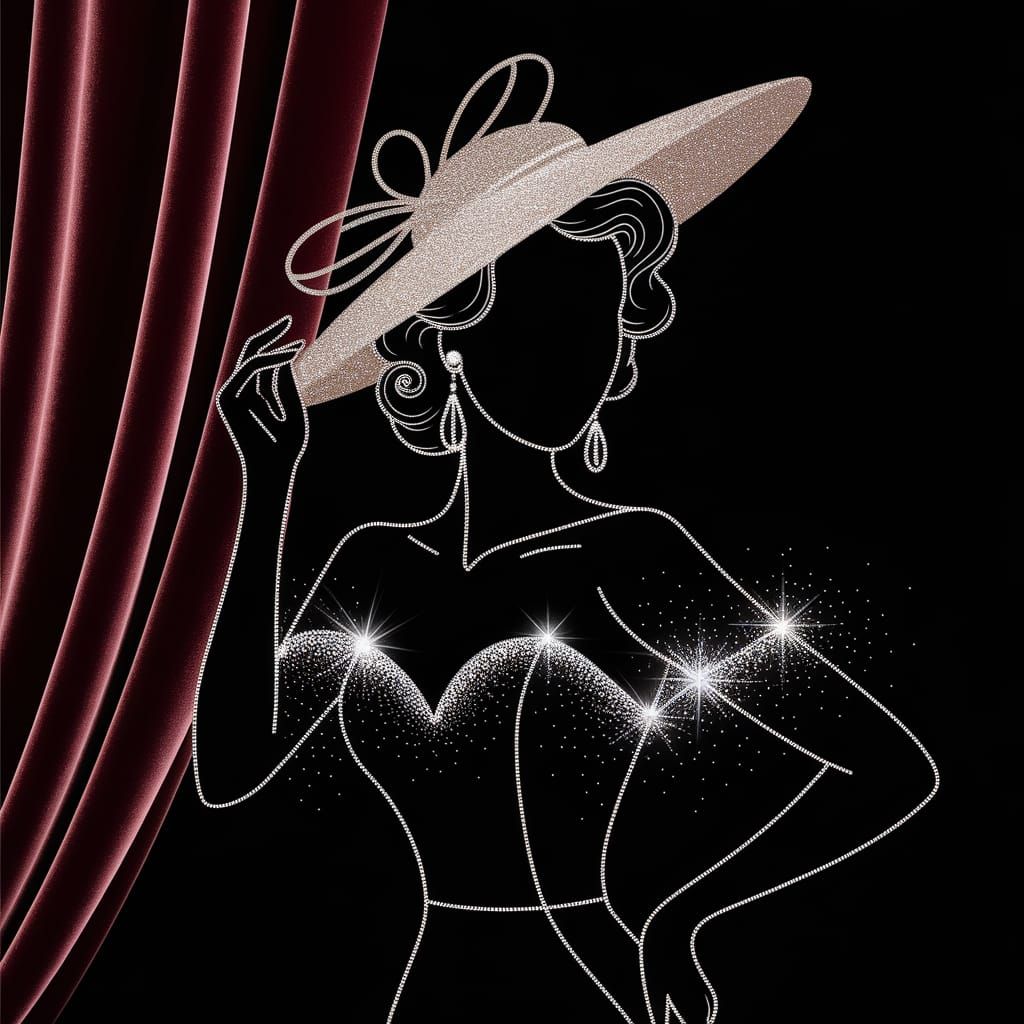 This image features a striking silhouette of a woman in a glamorous sparkling dress, elegant hat, and shimmering earrings. Rendered with clean lines and soft shadows, it evokes vintage glamour.