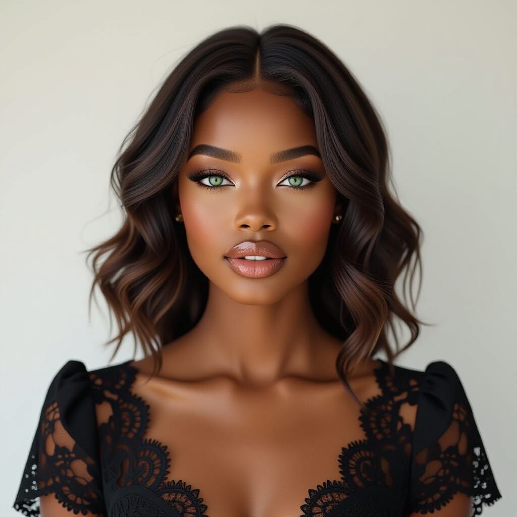 This image shows a light-skinned African woman with striking turquoise eyes and full, glossy lips. She is wearing a black lace dress and has wavy brown hair in a realistic style.