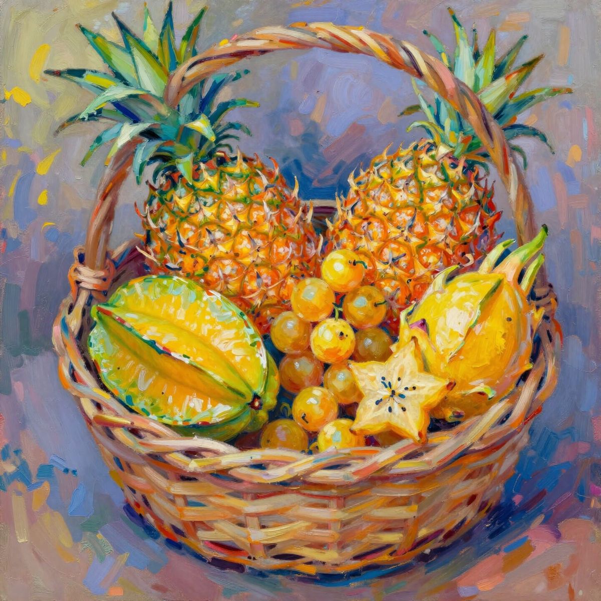 This image shows a woven basket overflowing with exotic fruits. Rendered in a bold, impressionistic style with rich impasto texture and luminous, saturated colors.