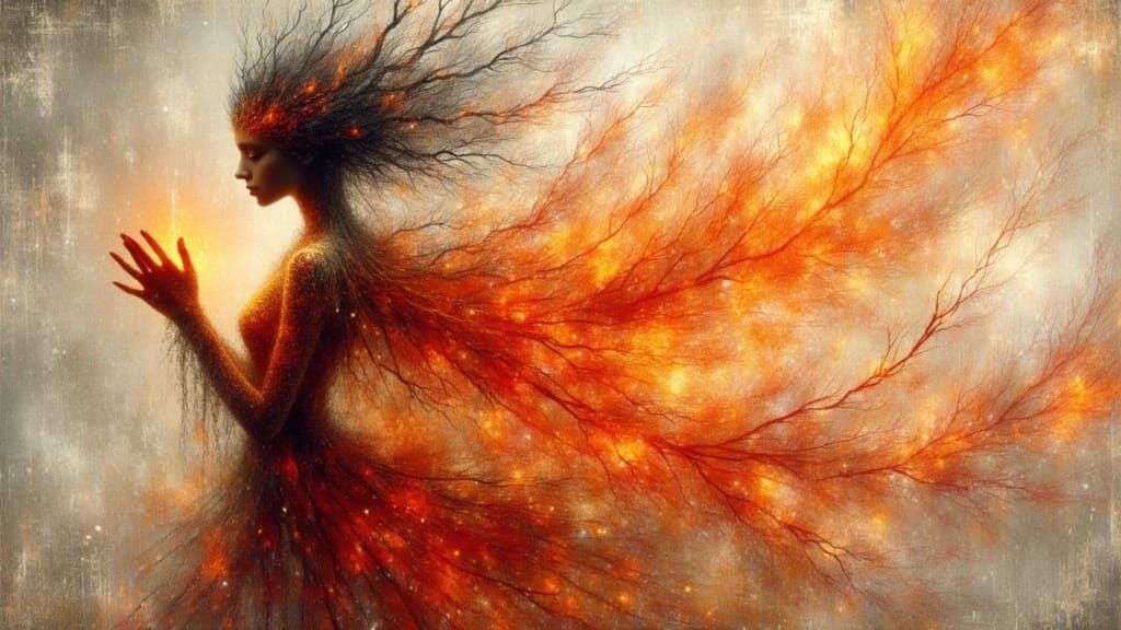 This enchanting image shows a mystical, doll-like fae with an ethereal glow, set against a backdrop of aged tiles and decoupage art, with intricate metallic accents and a minimalist fairycore aesthetic.