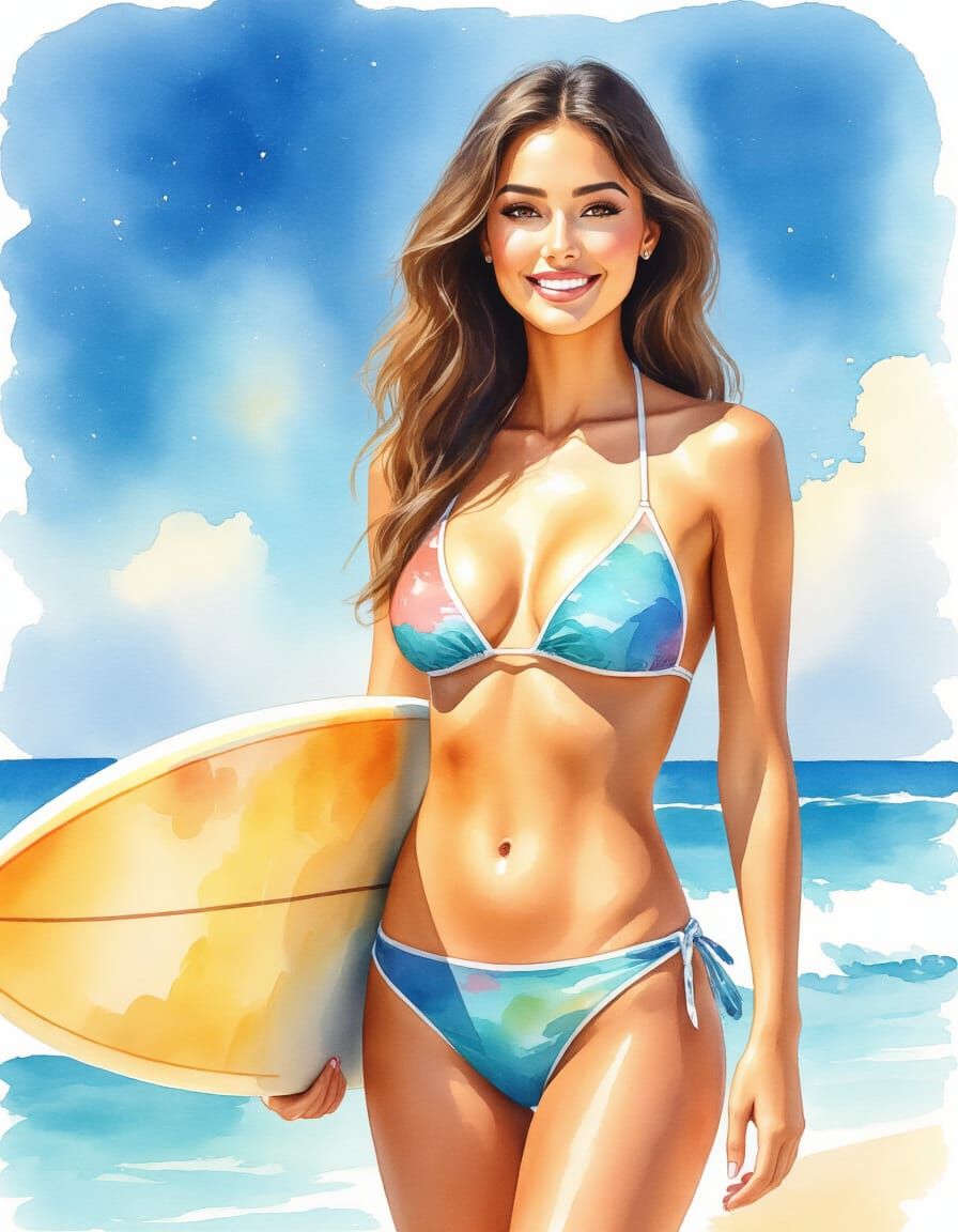 This image depicts a beautiful woman in a bikini holding a surfboard, rendered in a soft watercolor style. The artwork captures a serene beach scene.