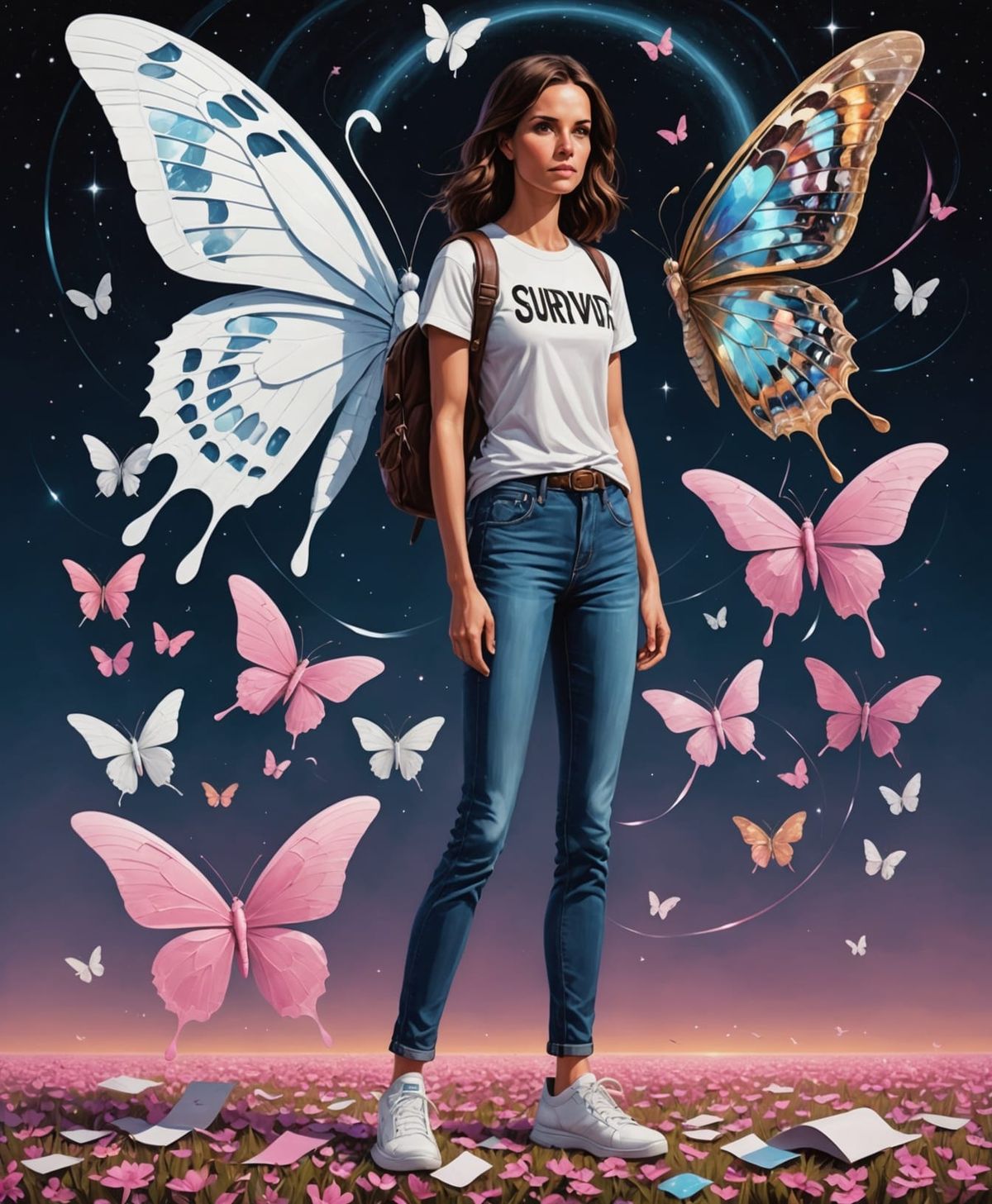 A digital painting of a woman in a "Survivor" t-shirt standing beside a breast cancer awareness ribbon with butterflies. The image is surreal, cinematic and highly detailed, in a maximalist style.