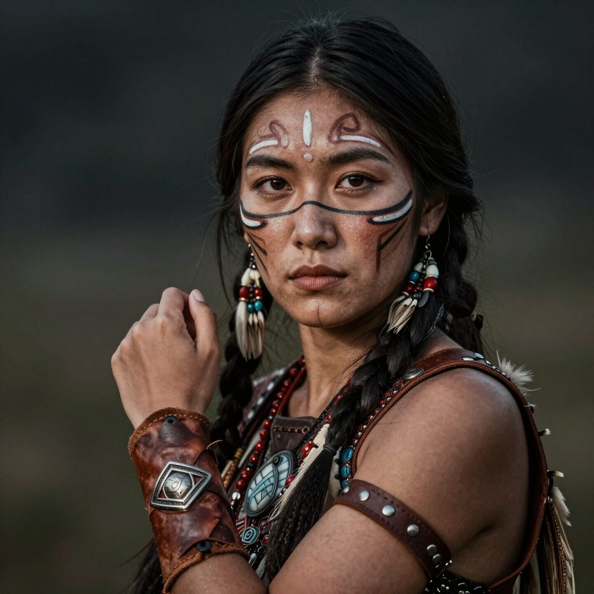Young American Indian Warrior lady. Face paint, leather wraps on her arm mussels. This lady is tough, but beautiful. intricate details, HDR, beautifully shot, hyperrealistic, sharp focus, 64 megapixels, perfect composition, high contrast, cinematic, atmospheric, moody
