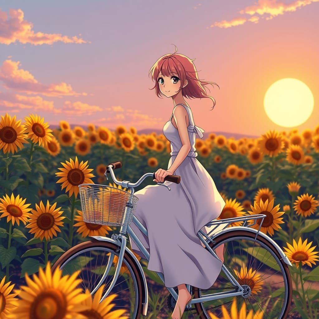 This vibrant anime image shows a pink-haired girl in a sundress cycling through sunflowers during a golden hour sunset. Features soft outlines and a painterly background.