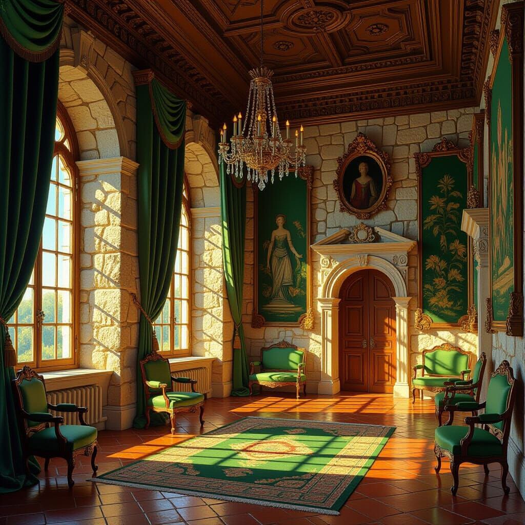 A view inside Machecoul castle with warm light and stone walls. Green tapestries adorn the walls in a romantic, vibrant style, reminiscent of old master oil paintings.