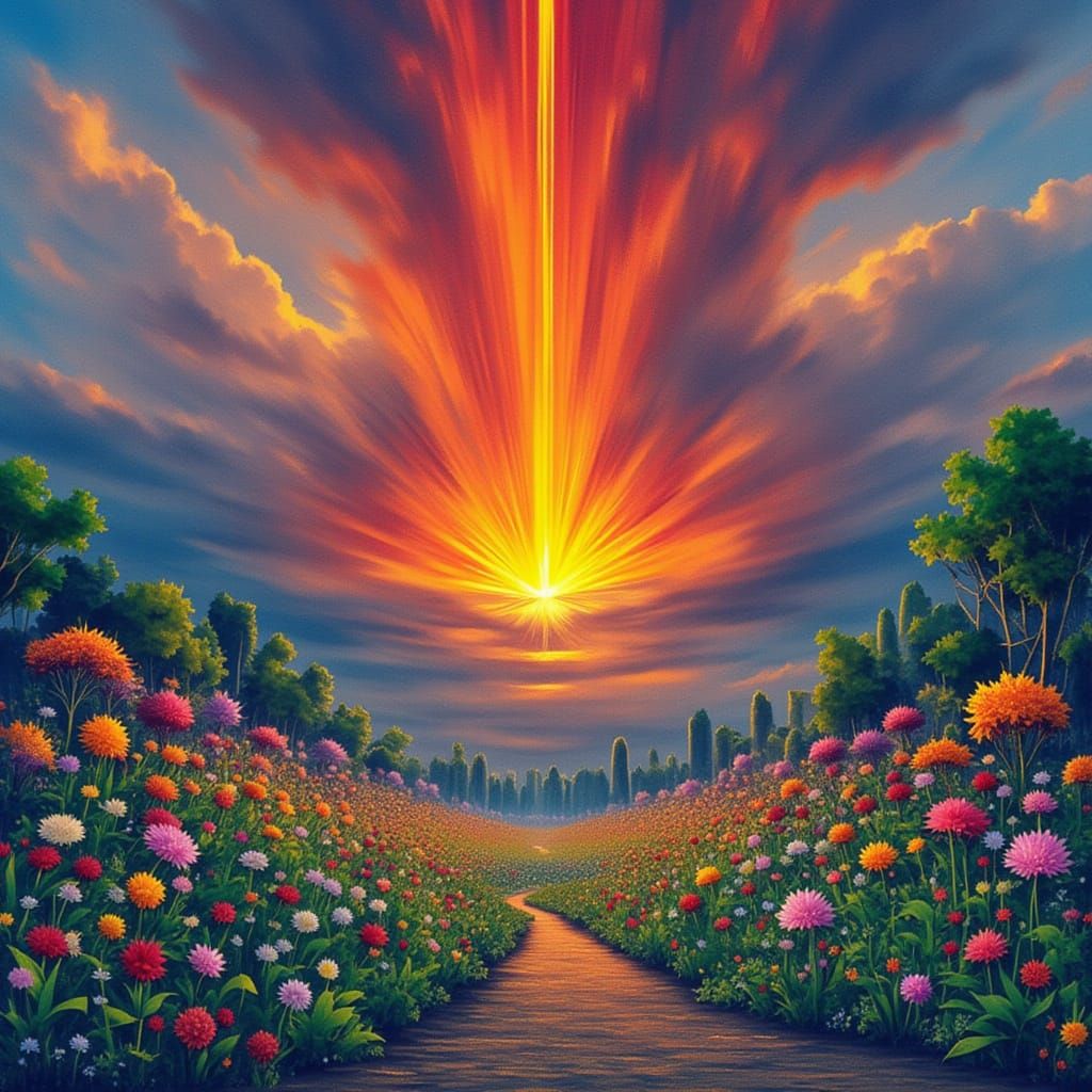 This image depicts a split scene: one side features a serene flower garden tended by cute robots, contrasting with a volcanic eruption and demonic creatures on the other, all rendered with vibrant colors in an anime aesthetic.