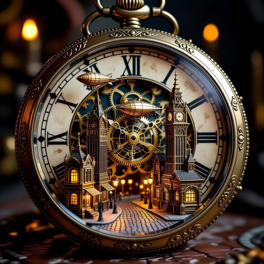 This image depicts a detailed miniature steampunk city built inside an antique pocket watch. Brass airships fly among cogwheel buildings, illuminated by warm, filament streetlights.