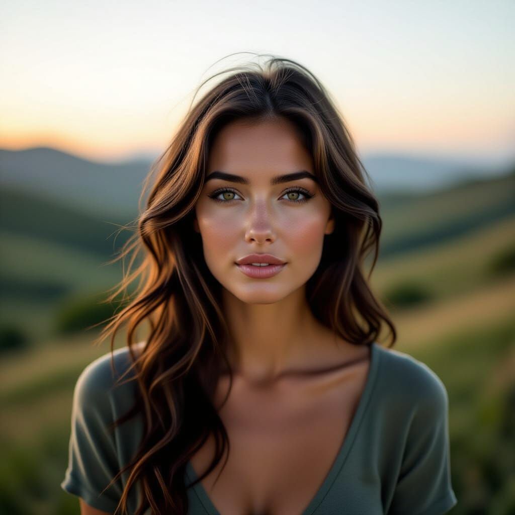 A striking picture of a panoramic landscape featuring hills shaped like a woman's body. The image is a close-up portrait with soft ambient light and a moody, high-contrast aesthetic.