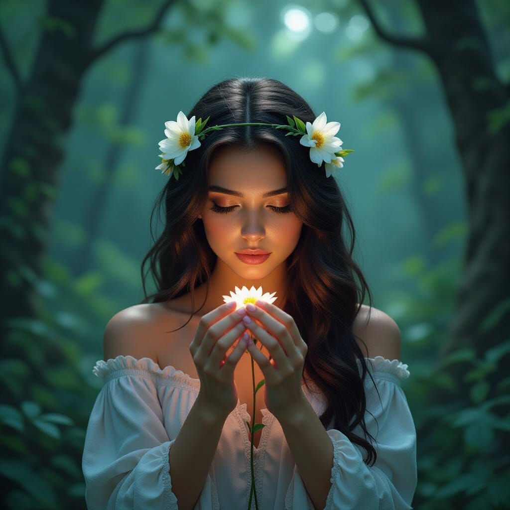 A striking picture of a sleeping maiden in a dark, enchanted forest as a tender beast gently places a flower in her hair. The image is reminiscent of hyperrealistic art with a magical atmosphere.