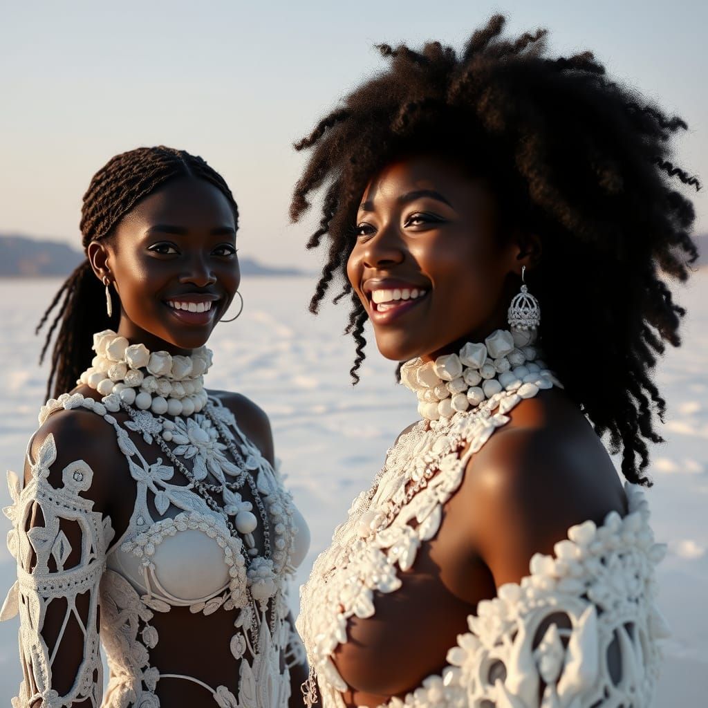 This image shows two smiling dark-skinned women in crystal-adorned clothing in a white desert. Pools of water reflect the sky in this hyperrealistic digital splash art landscape.