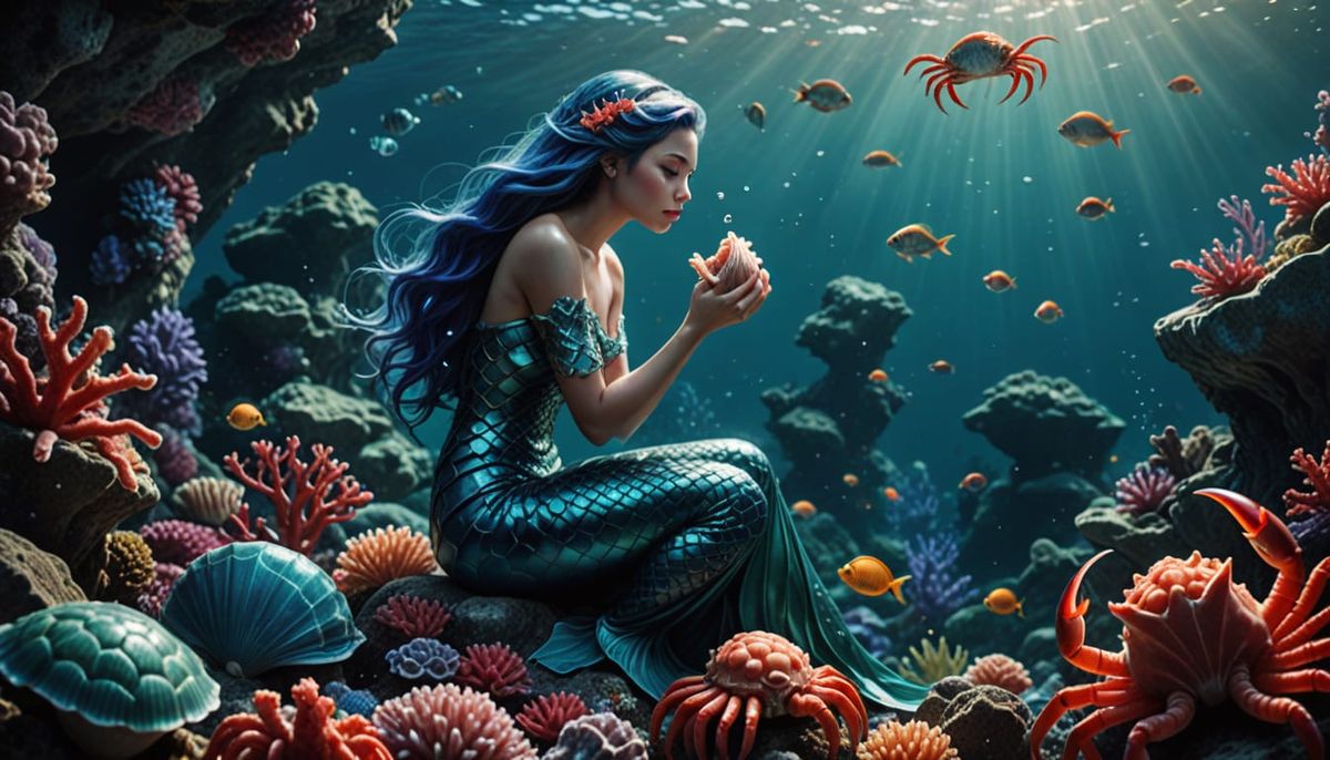 A striking picture of a mermaid blowing a conch shell on the ocean floor, surrounded by crabs. The image uses a shallow depth of field and warm lighting to create a serene scene.