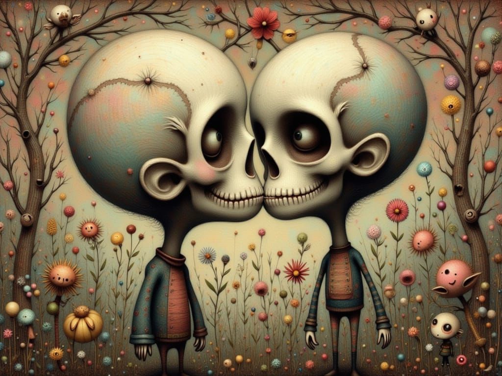 This image shows a whimsical wall art piece depicting love and skulls intertwined with vines. The artwork evokes a storybook aesthetic.