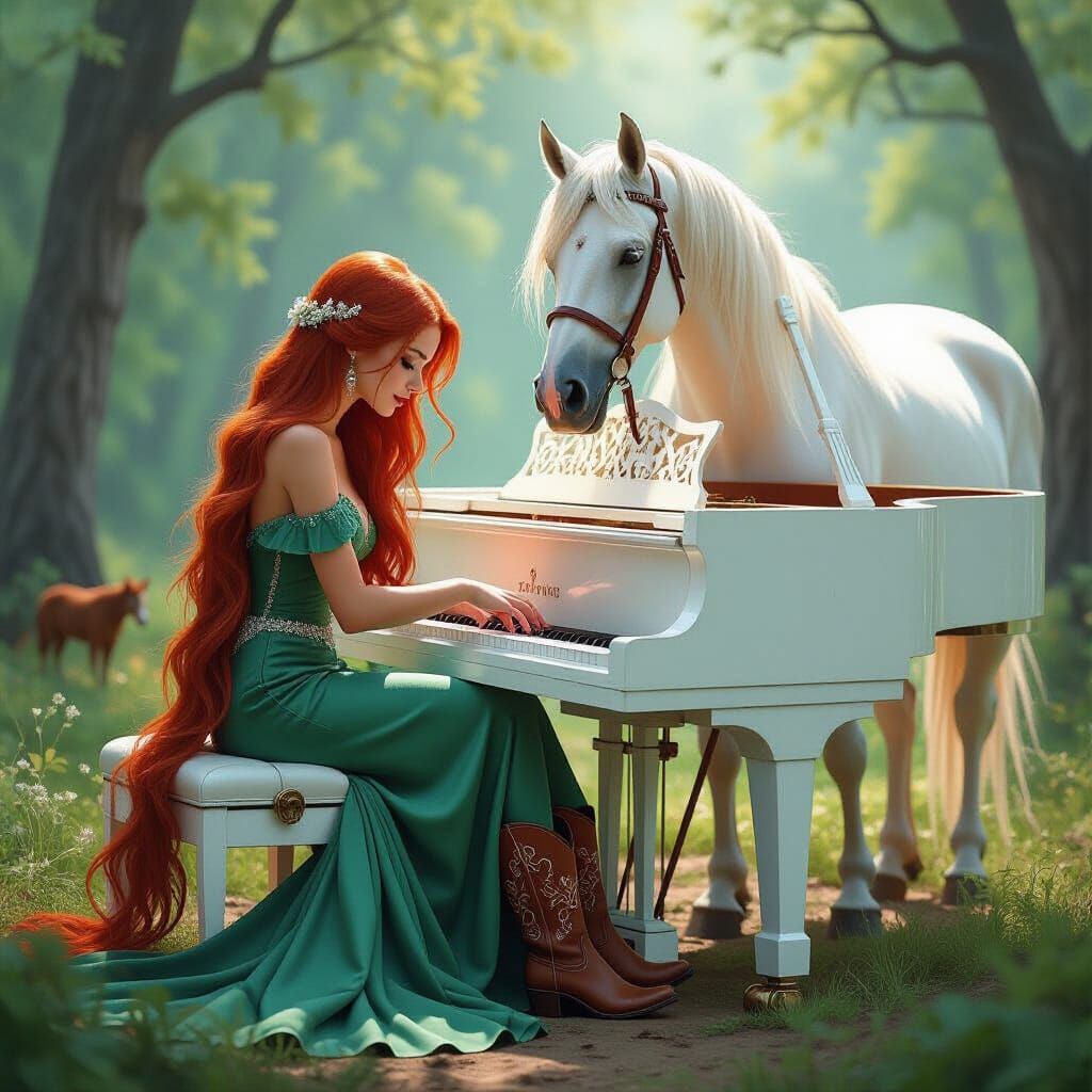 This image depicts a sorrowful bride with red hair and a green dress playing a grand piano, with a white horse nearby in a whimsical forest setting.