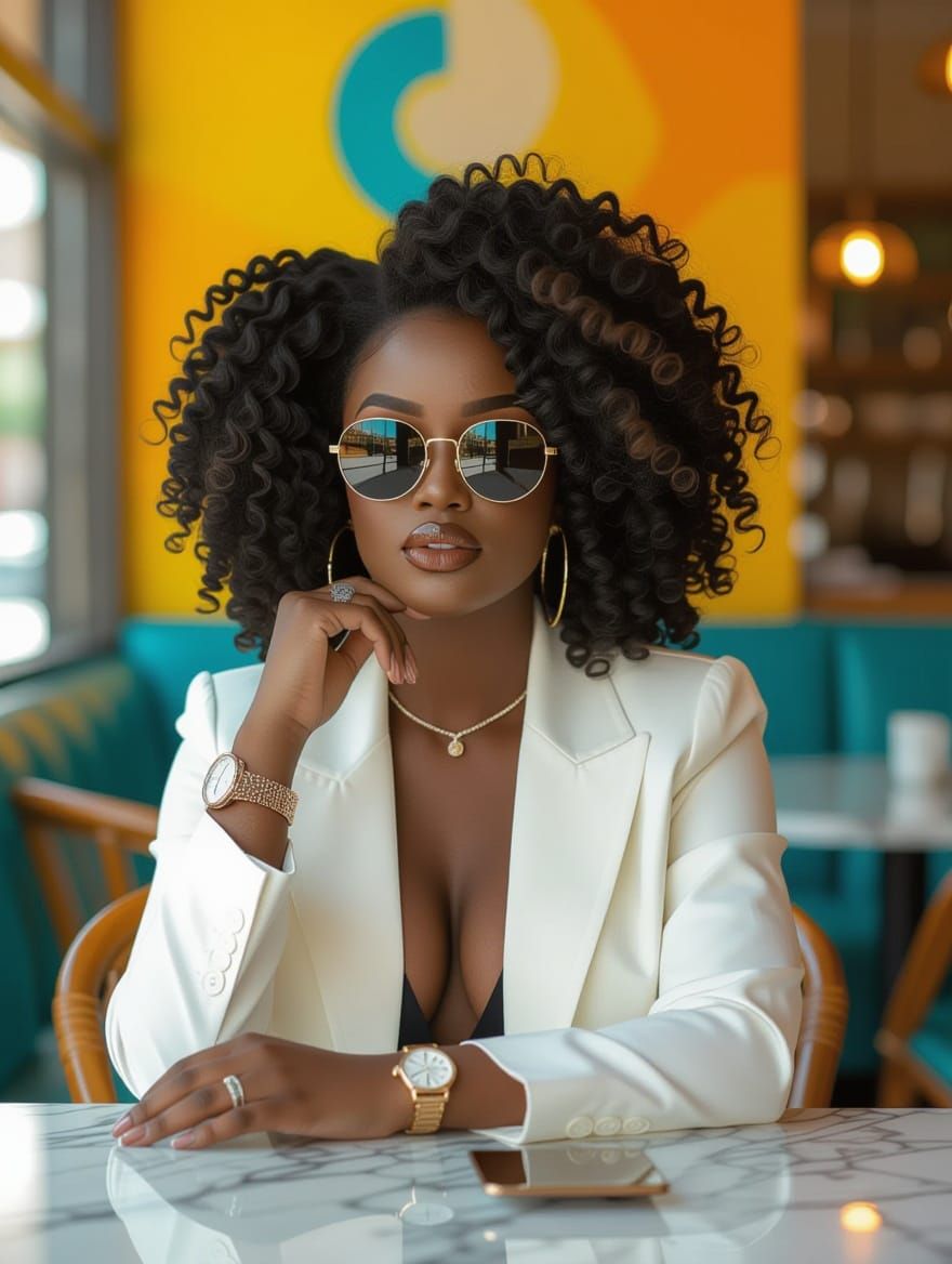 A striking picture of a confident Sudanese woman at a cafe. She wears a cream blazer and has a large afro hairstyle. Painted with bold impasto textures and vibrant colors.