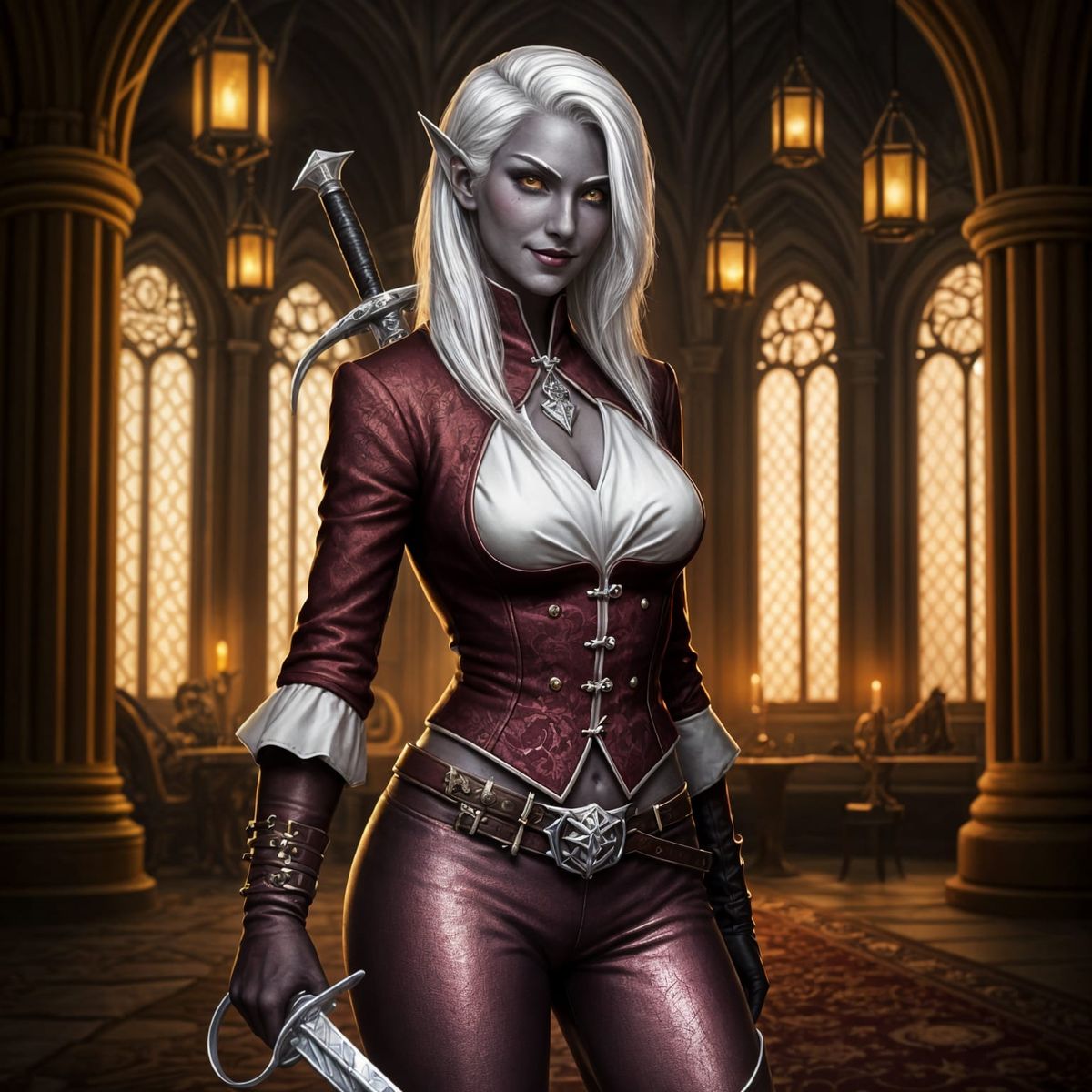 This image shows a striking drow woman with white hair and crimson makeup, wearing a brocade jacket and shimmering pants. She smiles in a noble lounge illuminated by soul-lanterns.