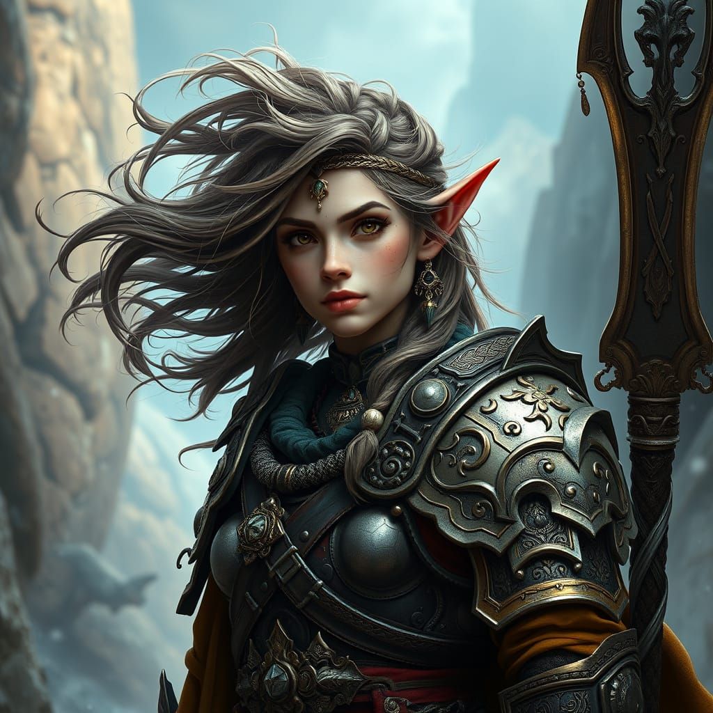 This image shows a female dwarf warrior in ornate armor, surrounded by fantastical elements and intricate textures, rendered in a vibrant, detailed style reminiscent of Simon Stalenhag and Ian McQue's works.