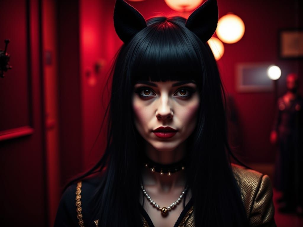 A striking cinematic portrait of a gothic punk character with red and black hair, wearing a spiked collar. The image features deep, contrasting colors and dramatic spotlighting with bokeh effects.