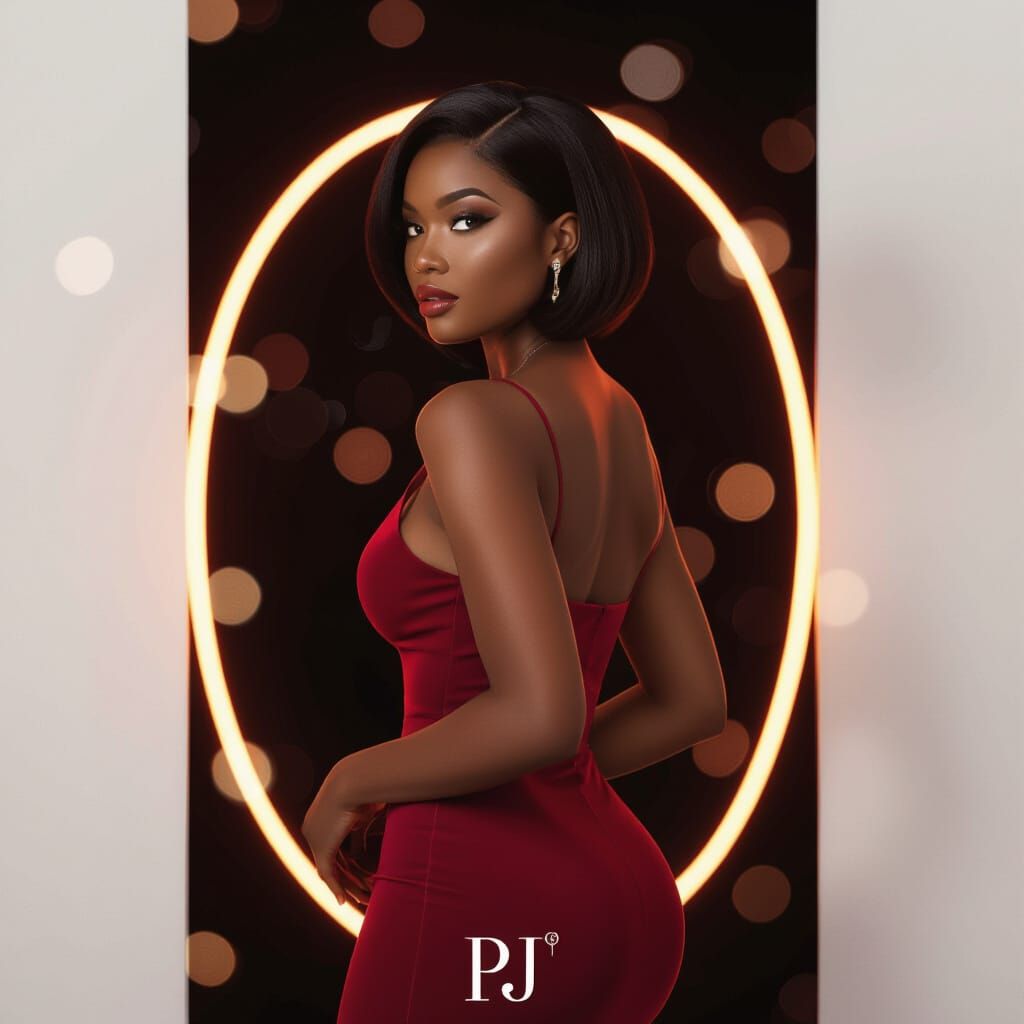 This image features a hyper-realistic portrait of a beautiful African American woman with a curvy figure, illuminated by warm burgundy lighting. The cinematic glow and dramatic contrast highlight her radiant skin and form-fitting dress.