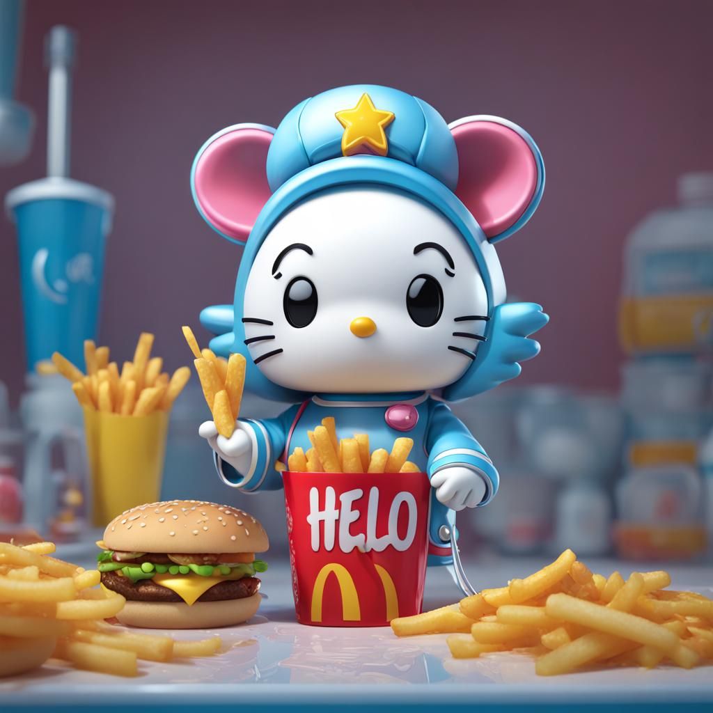 A hyperdetailed portrait of a Hello Kitty puppy with blue mouse and McDonald's fries. This digital painting features dynamic lighting and triadic colors in an Art Nouveau style.