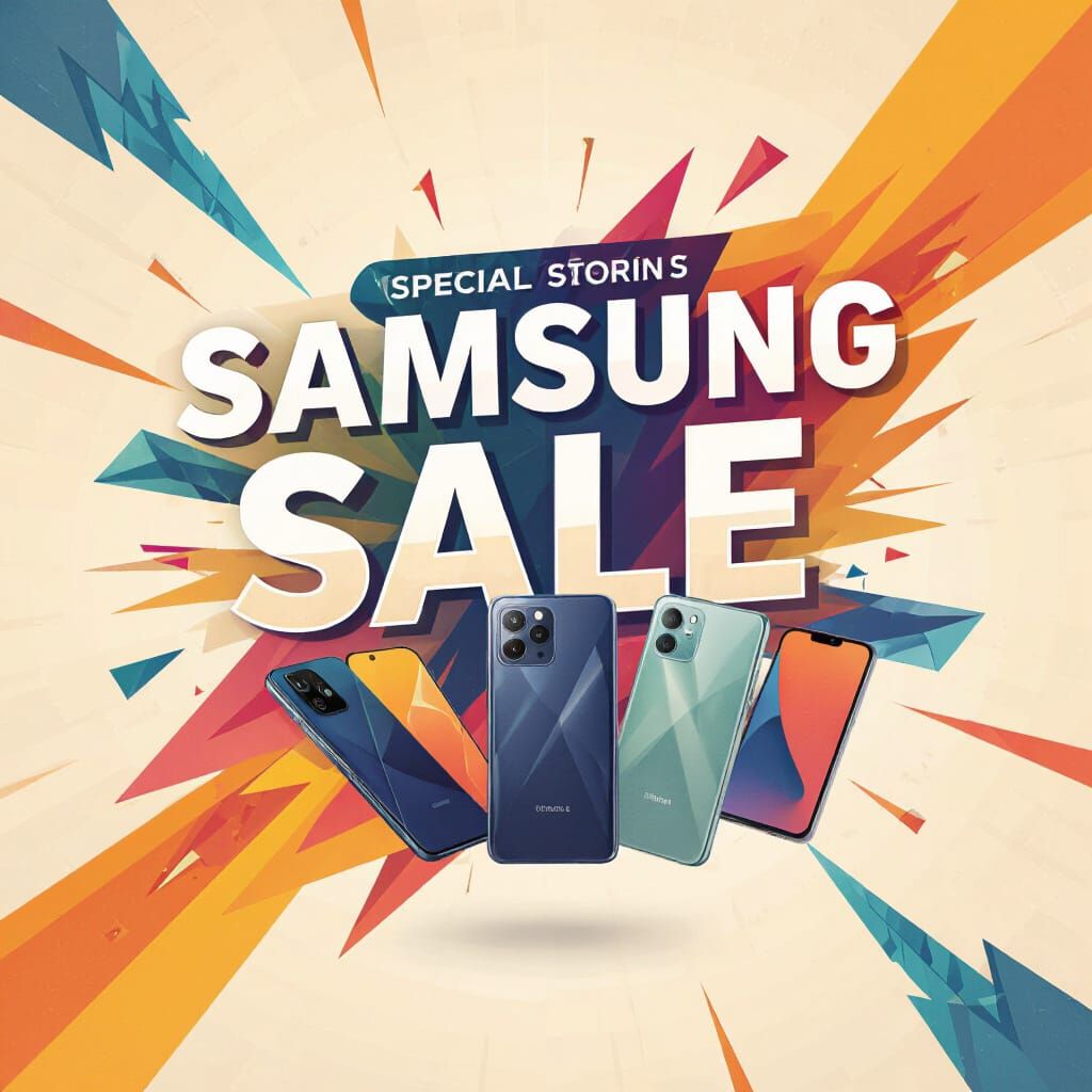 This image is an energetic Instagram banner for a Samsung phone sale at Max Phone store. It features bold typography, dynamic geometric shapes, and vibrant gradients, with studio-lit product shots.