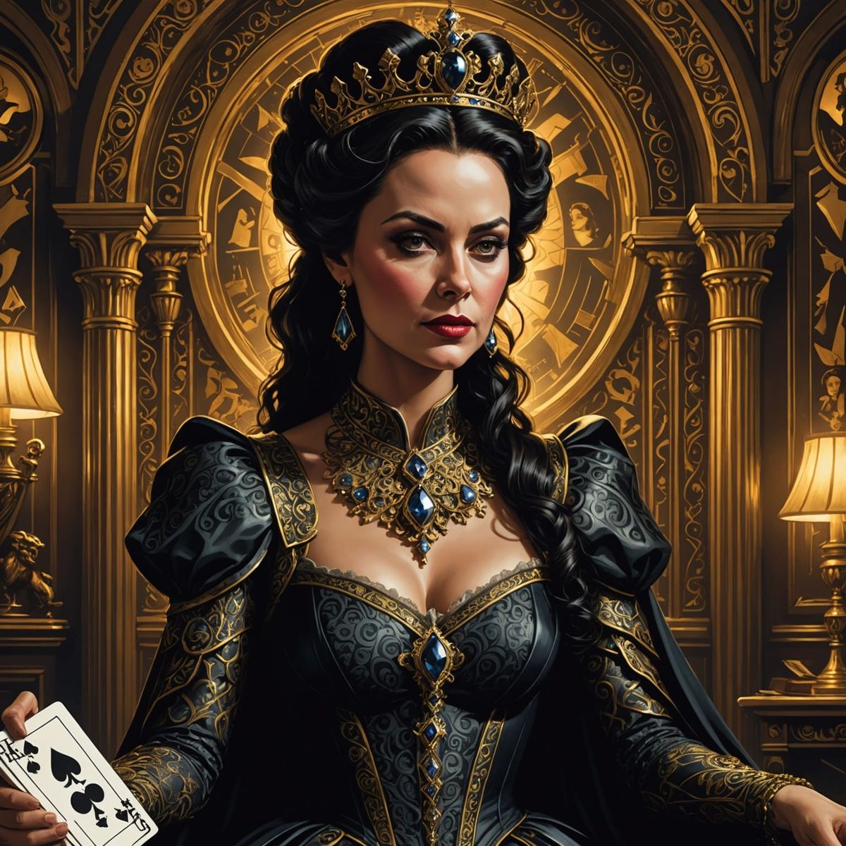 This image is an epic, cinematic digital matte painting of the Queen of Spades. It features dramatic lighting and atmospheric detail, rendered in a maximalist comic art style.