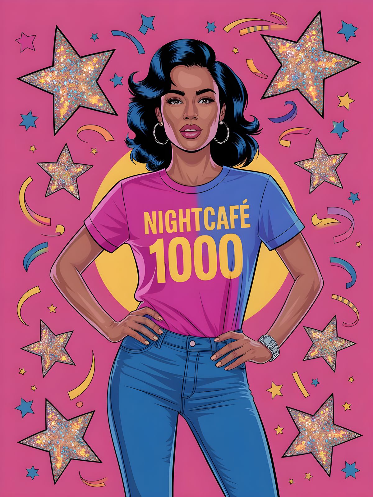 This image shows a confident woman in a pop art style, set against a bubble gum pink backdrop. She wears a T-shirt with bold text, surrounded by glittering stars and confetti, in a symmetrical layout.