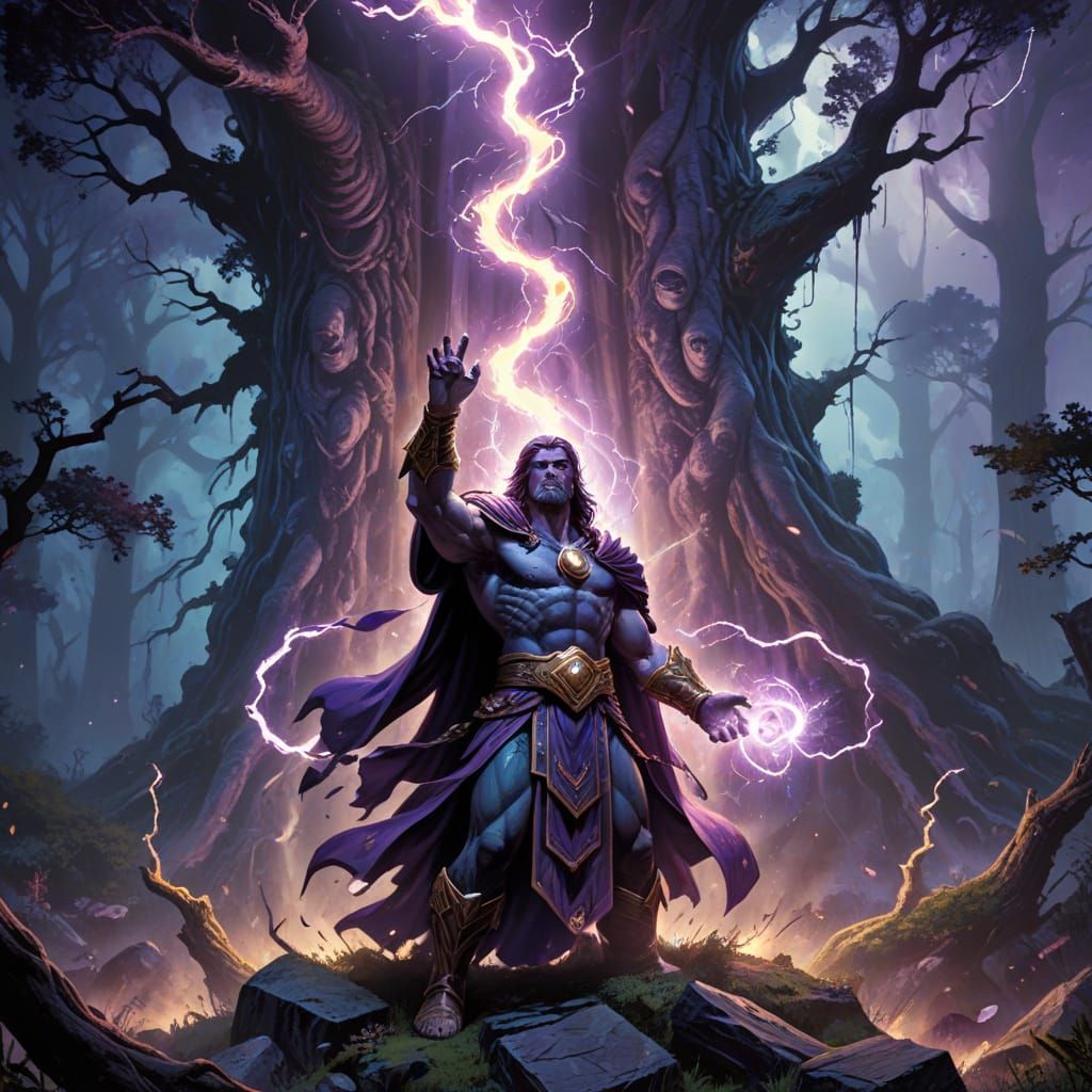 This image shows a fantasy illustration of a sorcerer summoning a mystical storm in a dark, ancient forest. The artwork features vibrant, electric blues and purples, with flashes of golden lightning, and detailed textures reminiscent of classic comic book art.