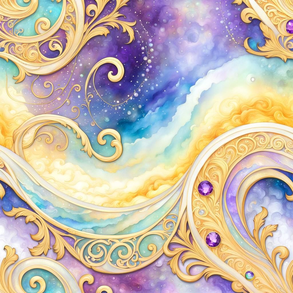 This image shows an ornate golden parchment scroll with rainbow light effects. The scroll features gold highlights, mother-of-pearl accents, amethyst crystals, and vibrant gouache swirls.
