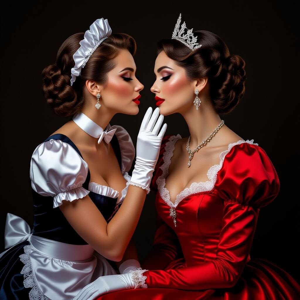 This portrait captures a French maid in satin kneeling before her mistress in a red gown. Features luxury makeup, lace details, and dramatic low-key lighting with rich, saturated colors.