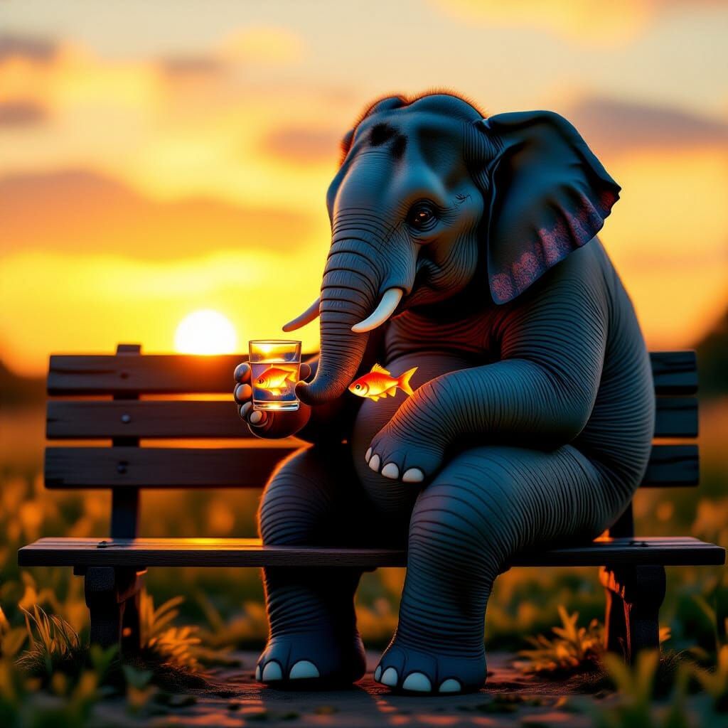 A heartwarming image of a giant elephant on a wooden bench at sunset, holding a glass with a glowing golden fish. Features a magical realism style with warm, cinematic lighting.