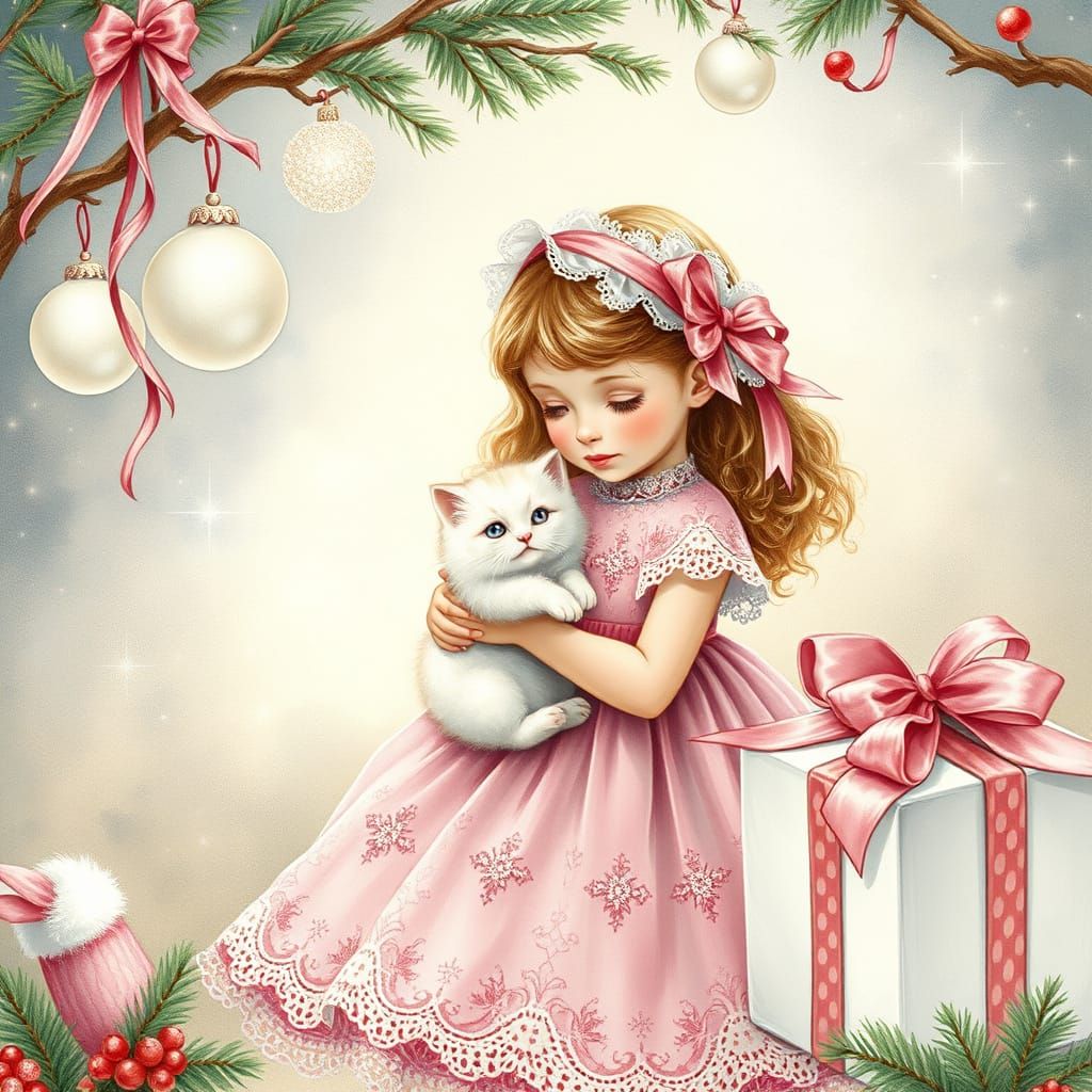 A charming image shows a young girl in a pink dress holding a kitten during Christmas. The scene is rendered with watercolor effects and festive decorations, reminiscent of classic children's book illustrations.