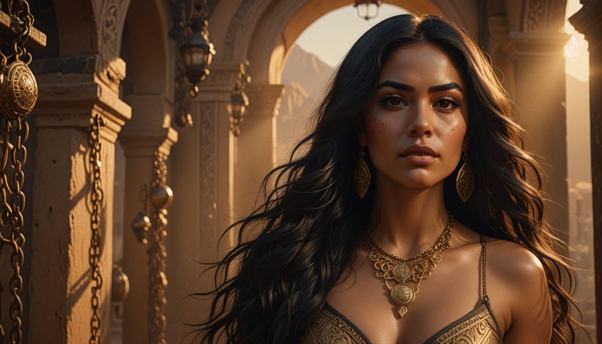 This digital painting features a toned Latina woman with an athletic hourglass figure, her body elegantly draped in golden chains. The portrait captures a sun-drenched, warm atmosphere with cinematic lighting.