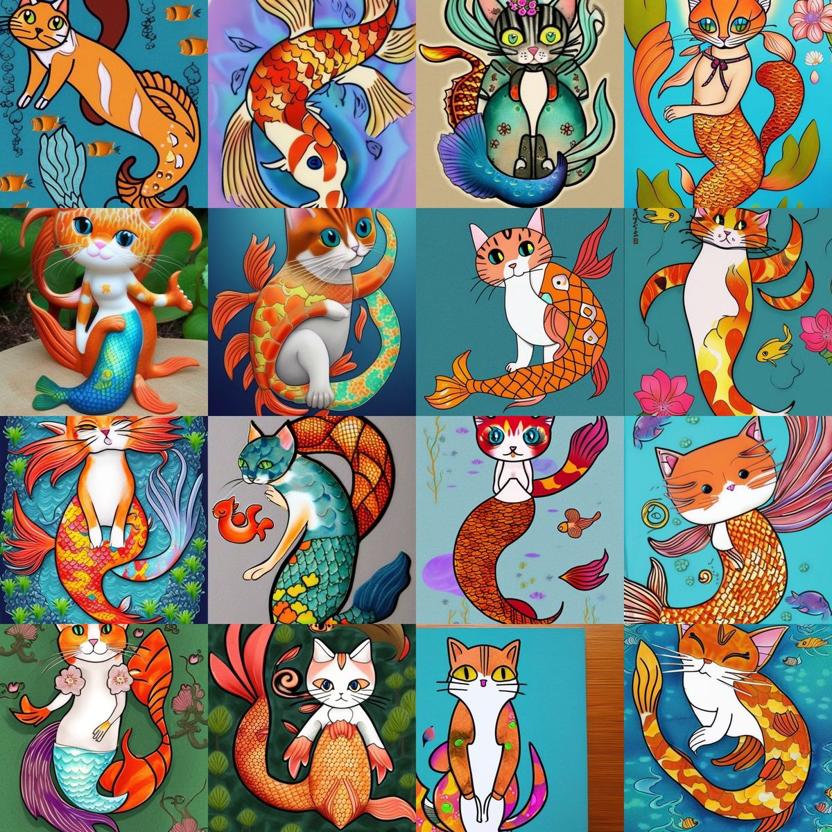 This image shows a whimsical fantasy creature that is part calico cat and part koi fish. It is a unique and imaginative take on a mermaid.