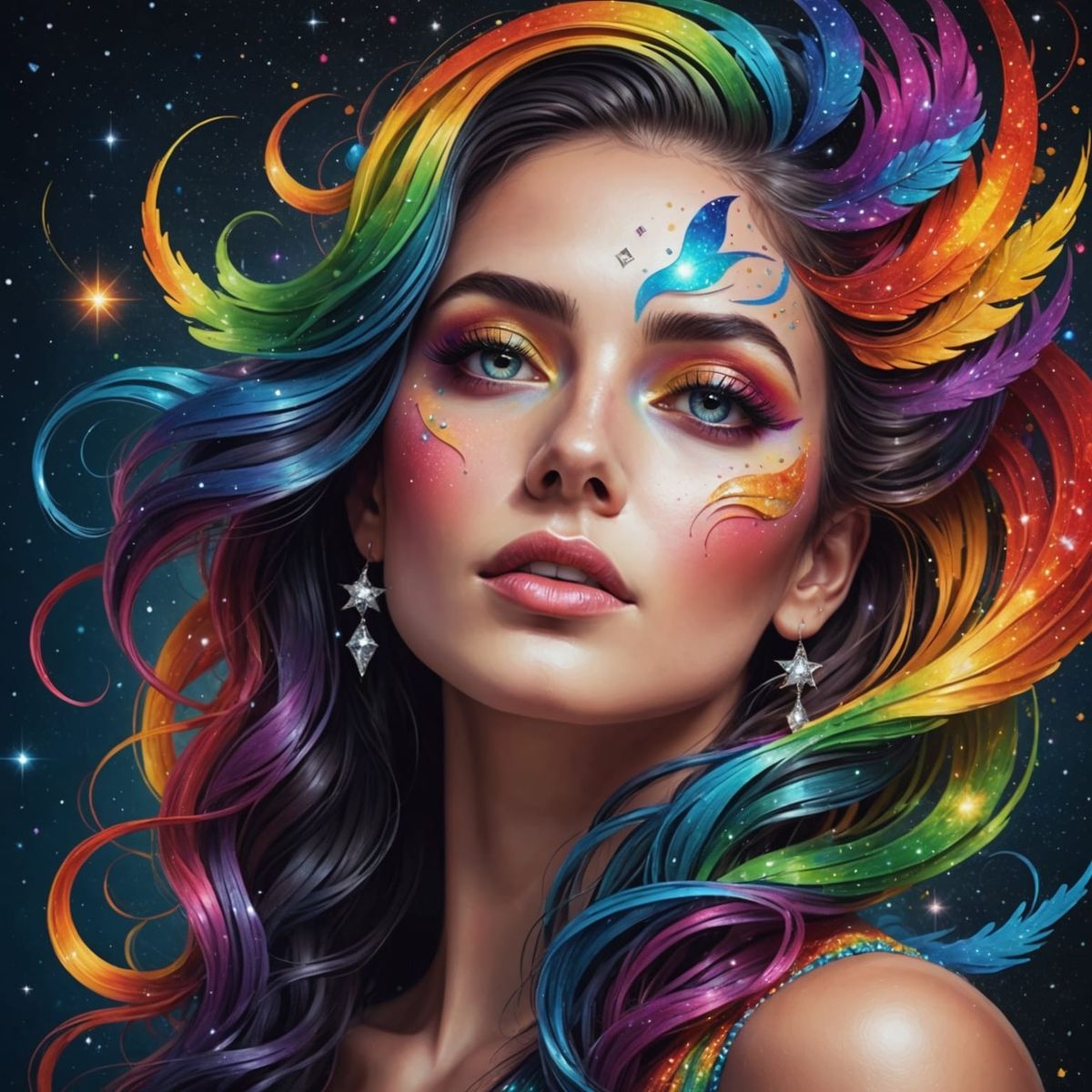 This image shows a vibrant, full-body portrait of a woman with rainbow coloring. She has long eyelashes adorned with diamond accents, set against a backdrop of a starry sky and swirling galaxies in splash art.