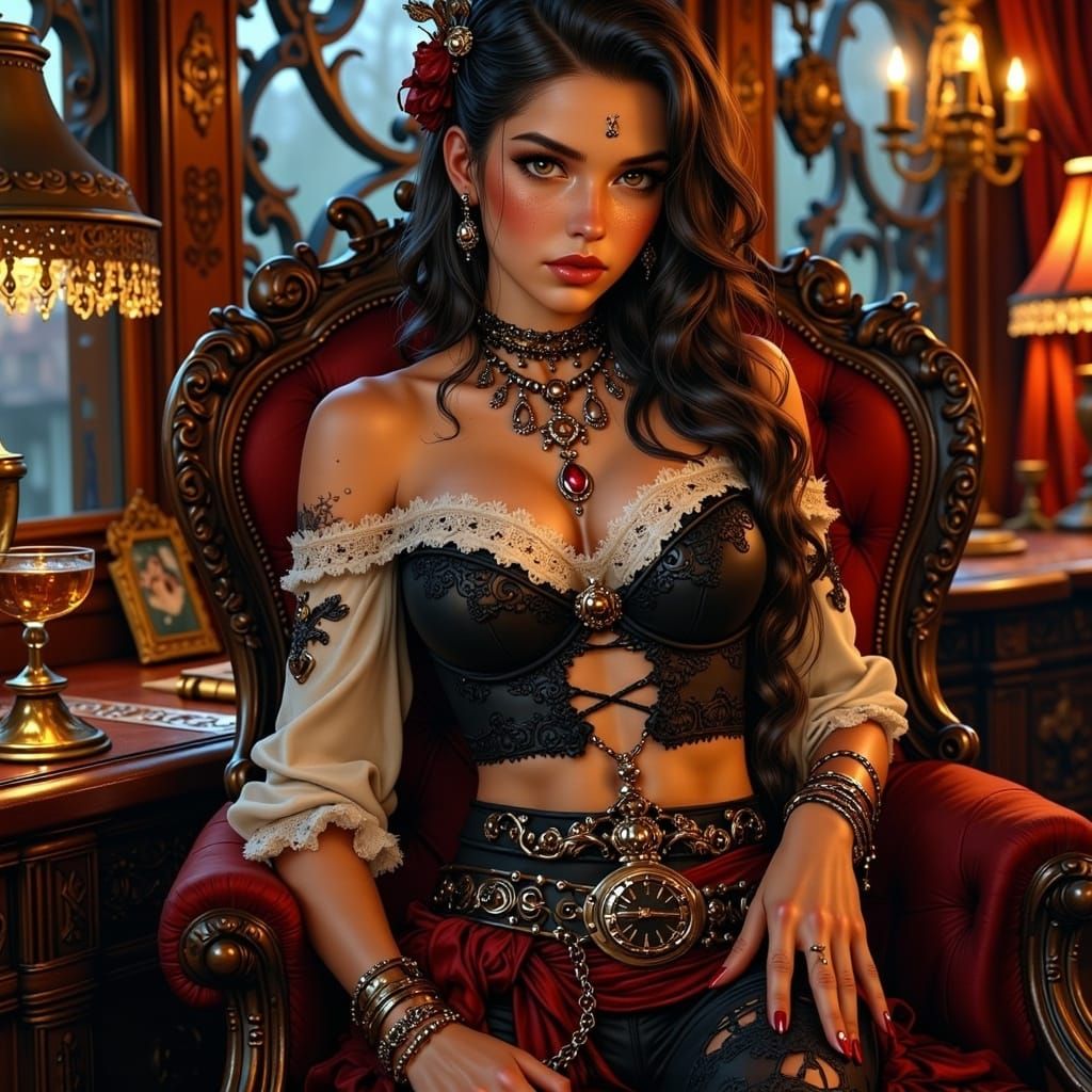 A highly detailed 4K image of a beautiful pirate captain in an ornate cabin, wearing lace attire and adorned with jewelry, enjoying rum. Features warm, golden lighting and exquisite textures.