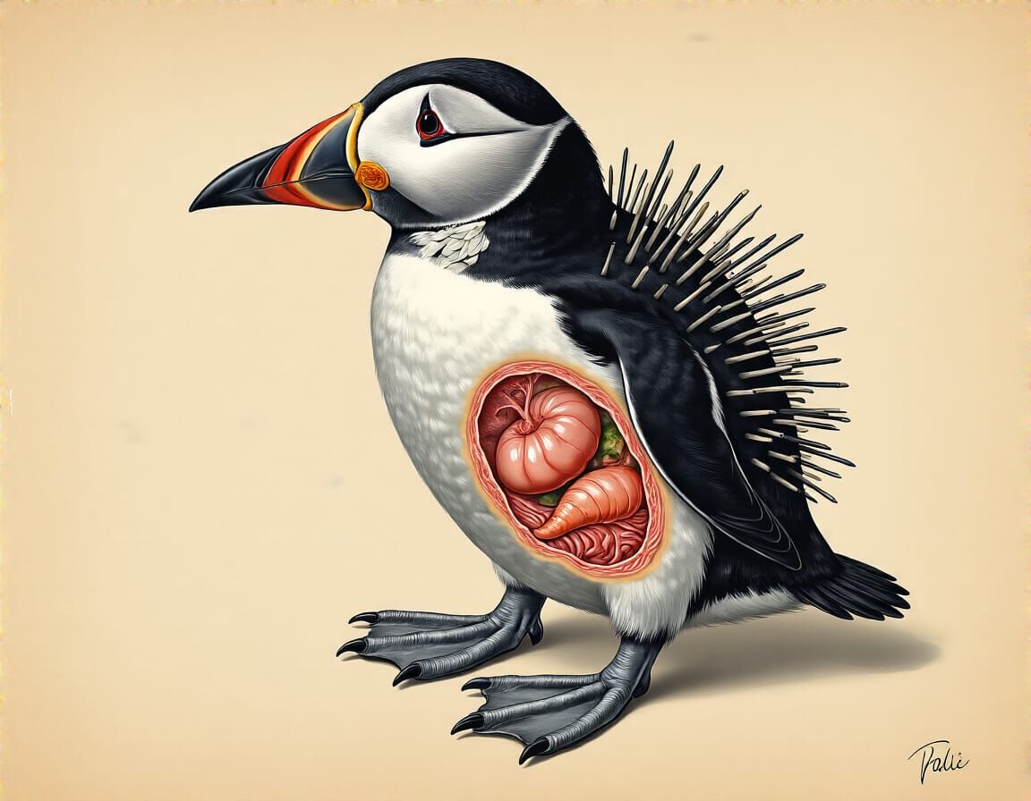 This image depicts a bizarre and unsettling hybrid creature, a disturbing amalgamation of various animals and anatomical elements, rendered in a surrealist artistic style.