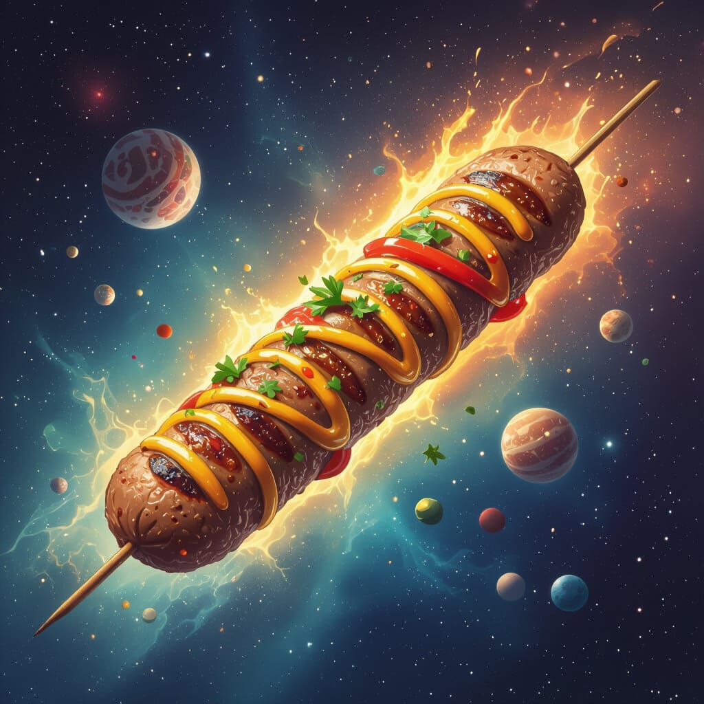 This AI-generated image features a vector illustration of a koobideh kebab drifting through the cosmos. It has a detailed fantasy concept art style with a splash screen aesthetic.